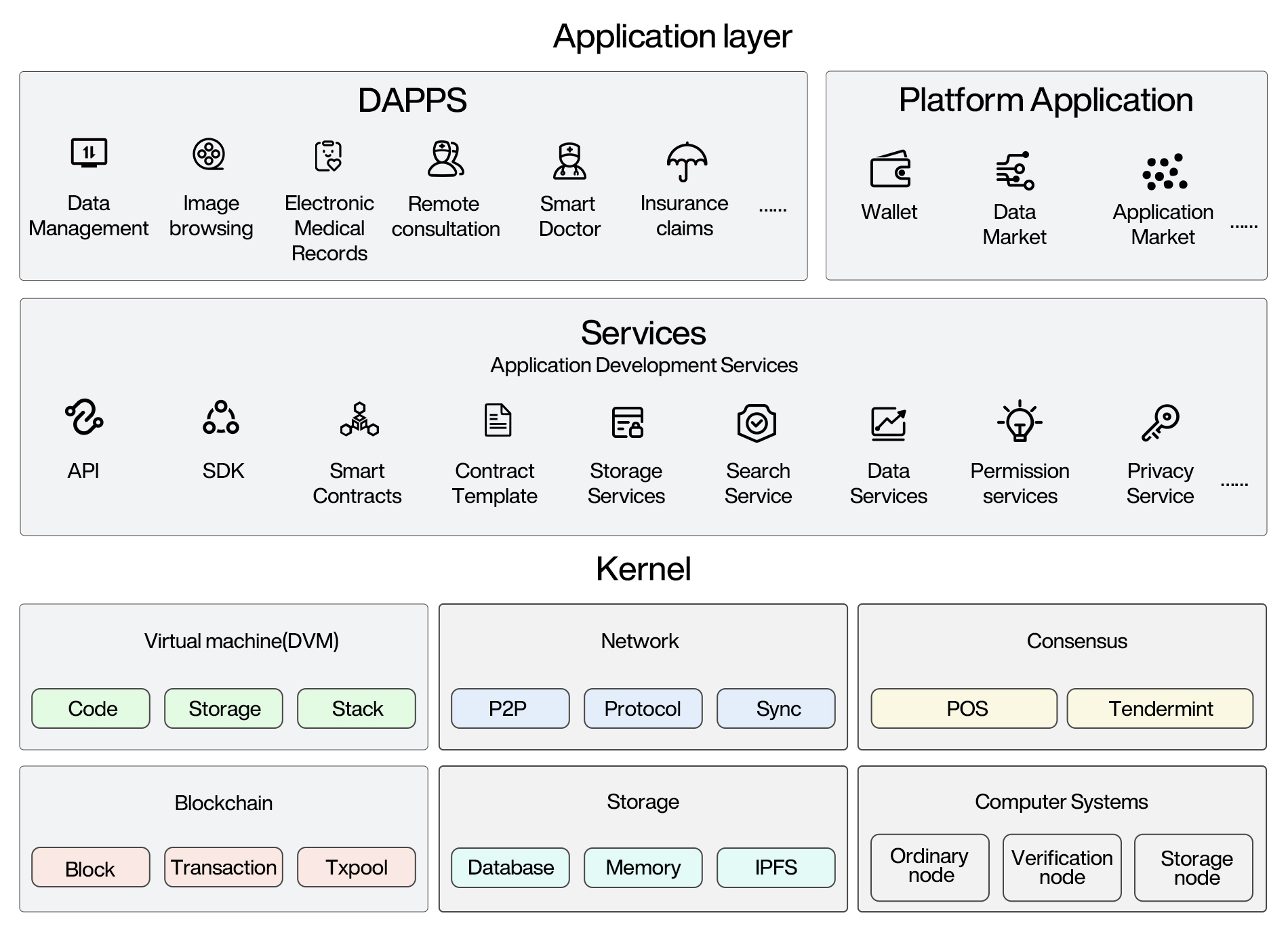 * **Access Control Service:** Manages role-based access and permissions for using various platform resources and APIs. It ensures that each application or user action is checked against their permission level. This service works across the stack to enforce security policies (for example, ensuring only licensed practitioners can execute certain medical DApps functions or only data owners can decrypt their records), thereby safeguarding the platform’s integrity.